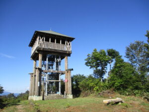 山頂には、地元の西山杉をふんだんに使用した高さ10mの展望塔が建っており、塔の上からは朝日連峰、月山、葉山、蔵王が360度一望できまさに絶景です。またこの展望塔にはロマンティックな音色のカリヨン鐘が備え付けられています。登った際はぜひ鳴らしてみてください。